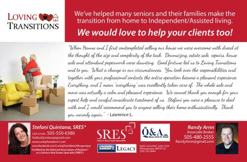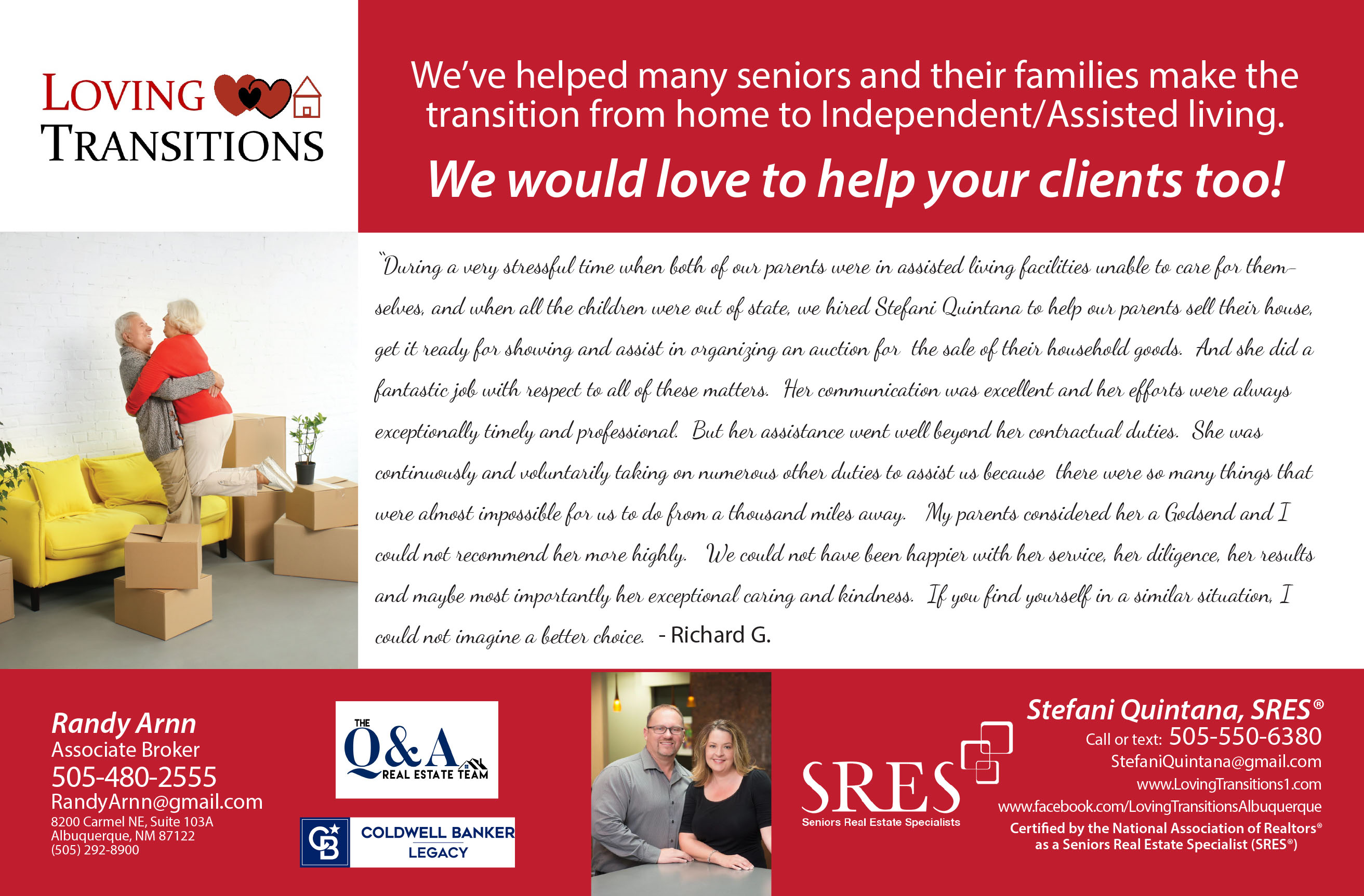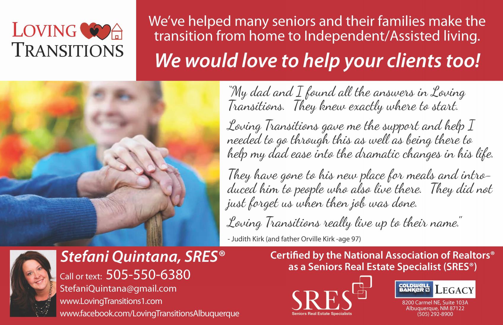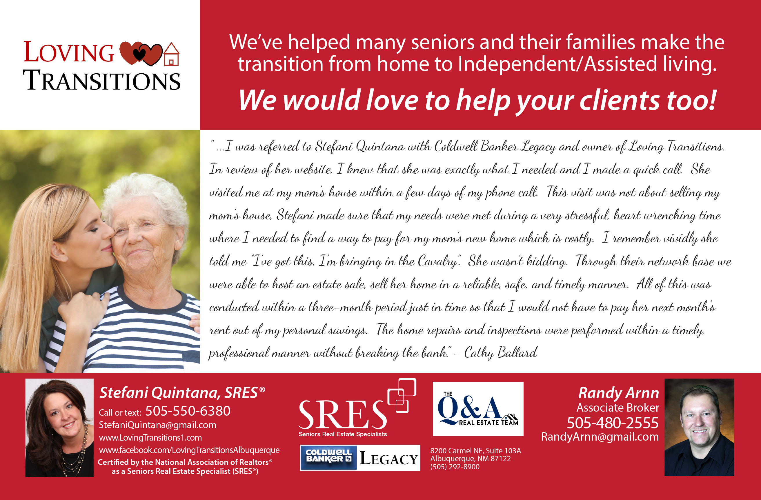 I was referred to Stefani Quintana with Coldwell Banker Legacy and owner of Loving Transitions. In review of her website, I knew that she was exactly what I needed and I made a quick call. She visited me at my mom’s house within a few days of my phone call. This visit was not about selling my mom’s house, Stefani made sure that my needs were met during a very stressful, heart wrenching time where I needed to find a way to pay for my mom’s new home which is costly. I remember vividly she told me “I’ve got this, I’m bringing in the Calvary”. She wasn’t kidding.